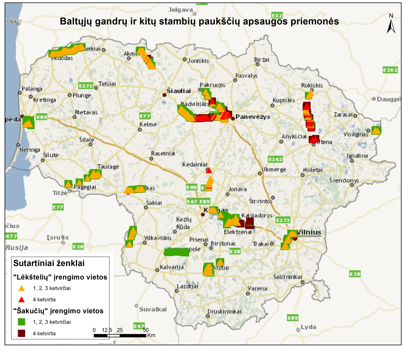 2015 metais LITGRID didino pavojingų paukščiams vietų laidų matomumą ant jų uždėjus 1494 specialiai tam pagamintas baltos spalvos spirales. Be to, penkiose, ypač pavojingose paukščiams vietose, išskirtiniam laidų vizualizacijos padidinimui buvo iškabinti 1255 specialūs pakabukai (angliškai “bird diverters). Paukščių, pagrinde baltųjų gandrų, apsaugai nuo žūties dėl trumpo sujungimo pagal projekto pradžioje parengtą studiją buvo įrengtos specialios apsaugos priemonės – 2582 „šakutės“ ir 1820 „lėkštučių“. „Šakutės“ neleidžia paukščiams nutūpti pavojingose aukštos įtampos elektros perdavimo linijų atramų vietose, o „lėkštutės“, kurios įrengiamos virš minėtų atramų izoliatorių, sumažina trumpo jungimo galimybes. Visos minėtos priemonės skirtos ne tik Lietuvos, bet ir migruojančių ar mūsų šalyje žiemojančių paukščių apsaugai. Todėl jis svarbus tarptautiniu mastu, siekiant užtikrinti saugias sąlygas migruojantiems sparnuočiams, tuo pačiu įgyvendinant tarptautinio susitarimo dėl Afrikos ir Eurazijos migruojančių paukščių išsaugojimo (AEWA) reikalavimus. Prie šio susitarimo Lietuva prisijungė 2004 metais.